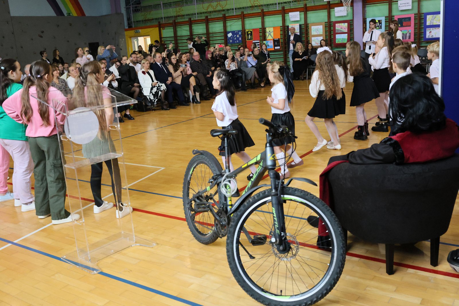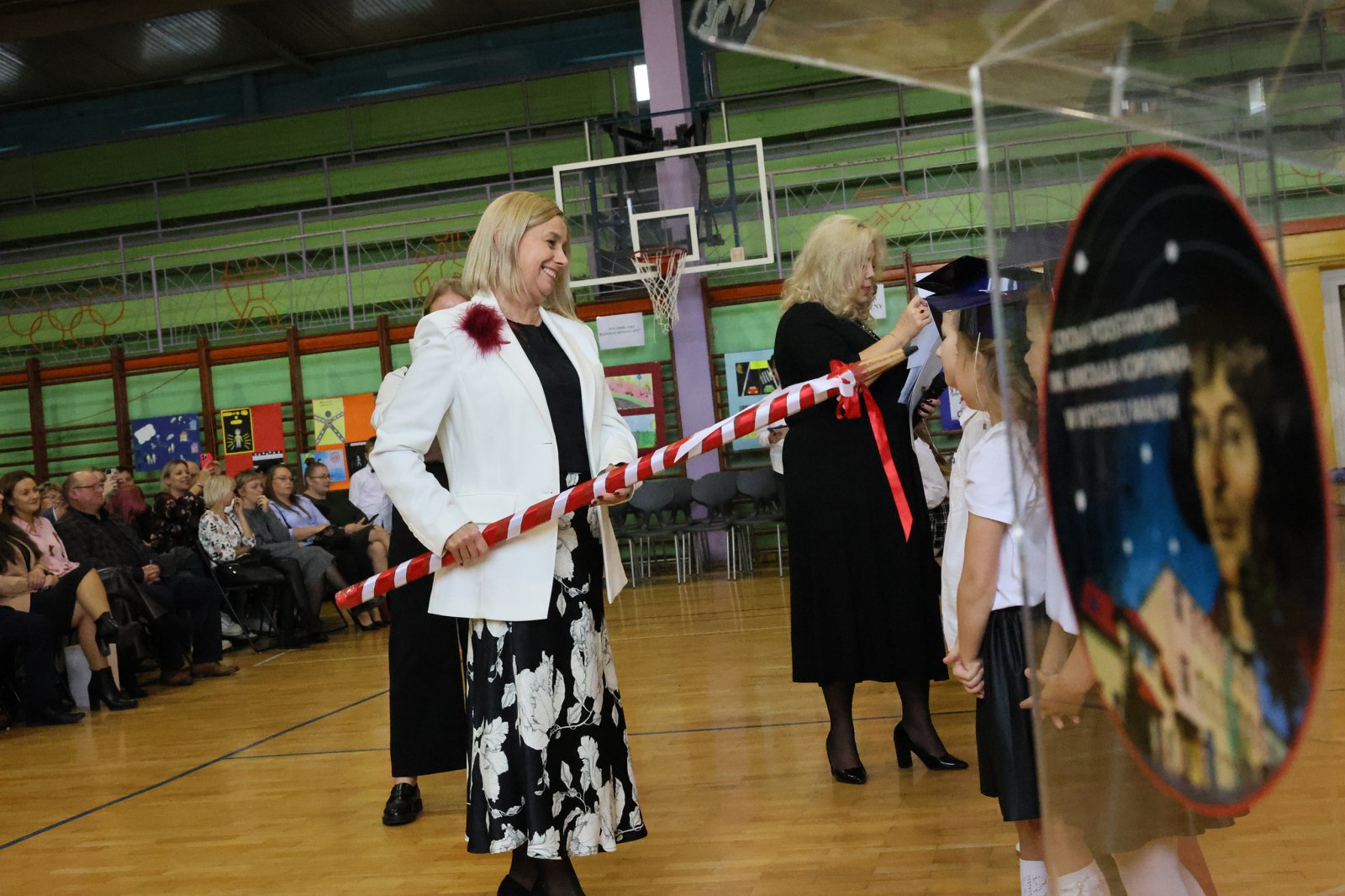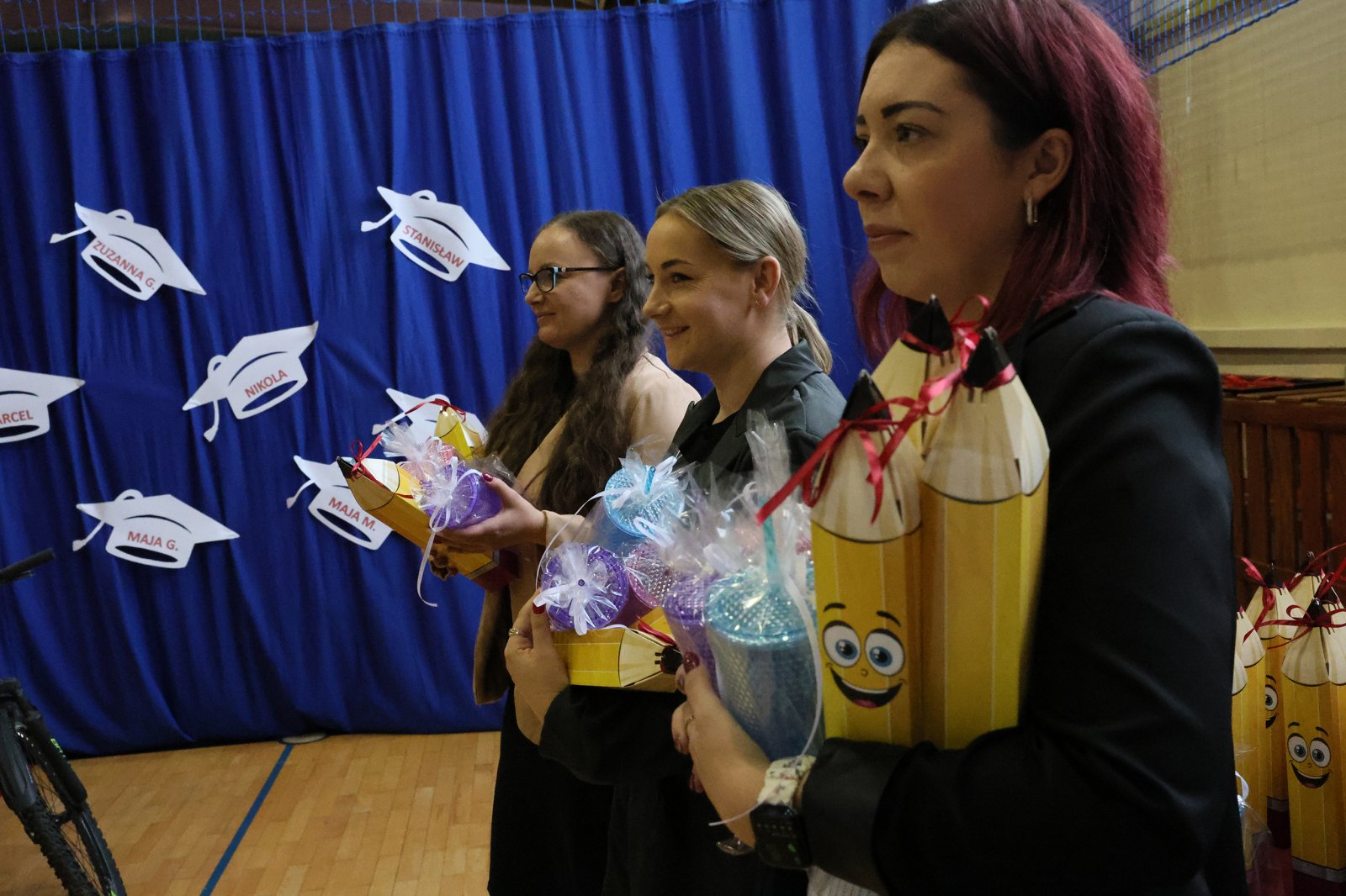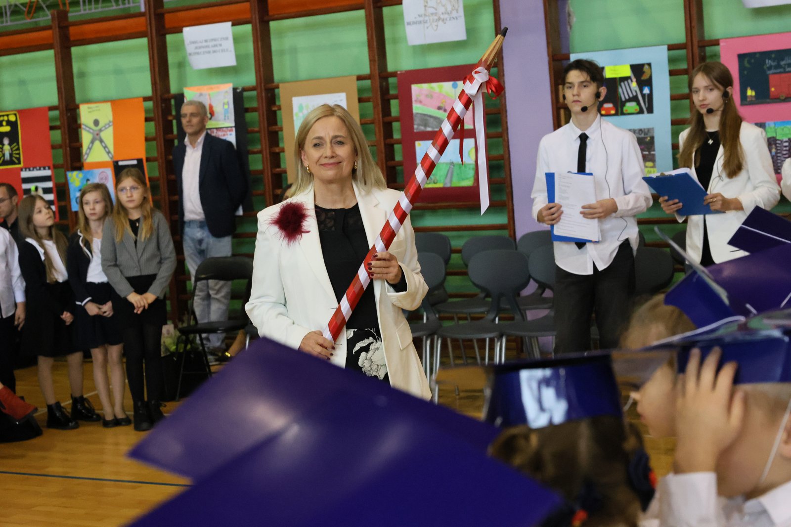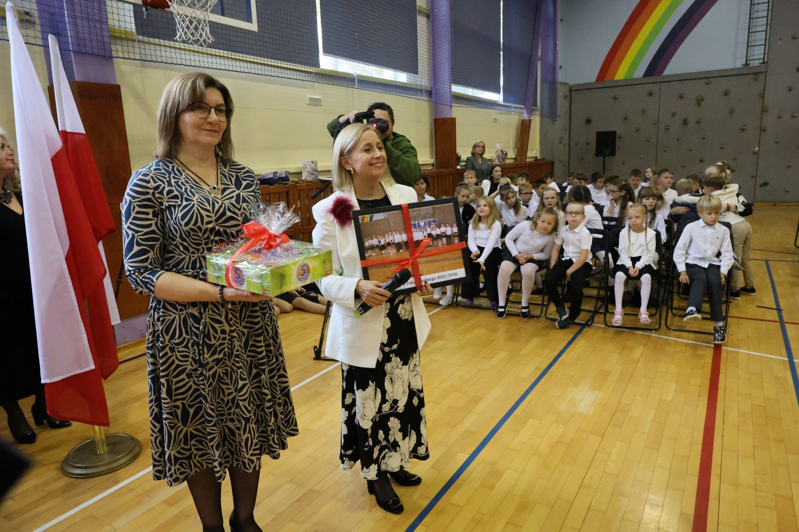 Gratulacje uczniom i ich rodzicom złożyła także Joanna Jabłecka, wiceprzewodnicząca Rady Gminy Przygodzice. – Cieszę się, że moja dawna szkoła, którą pamiętam ze swojego dzieciństwa, tak prężnie się rozwija i tyle się w niej dzieje. W dowód wdzięczności przekazuję na ręce pani dyrektor – wraz z sołtysem – ten bukiet kwiatów.
